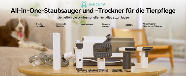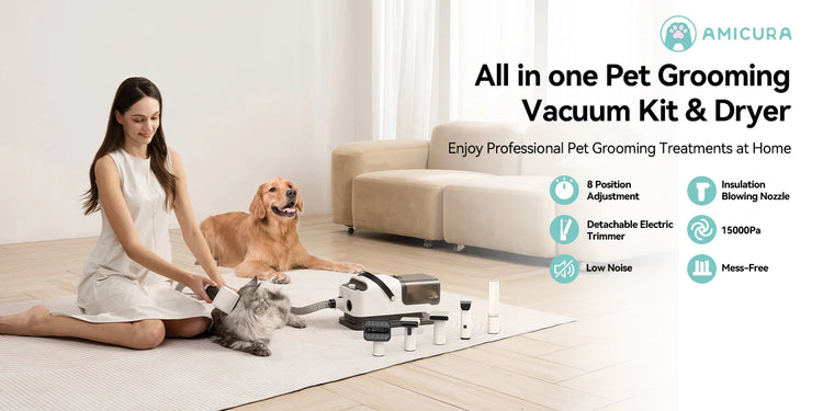 Amicura P1 Vacuum Cleaner & Hair Dryer 15kpa, Pet Grooming Set Adjustable Speed and Temperature, 5 Proven Care Tools Dog Clipper